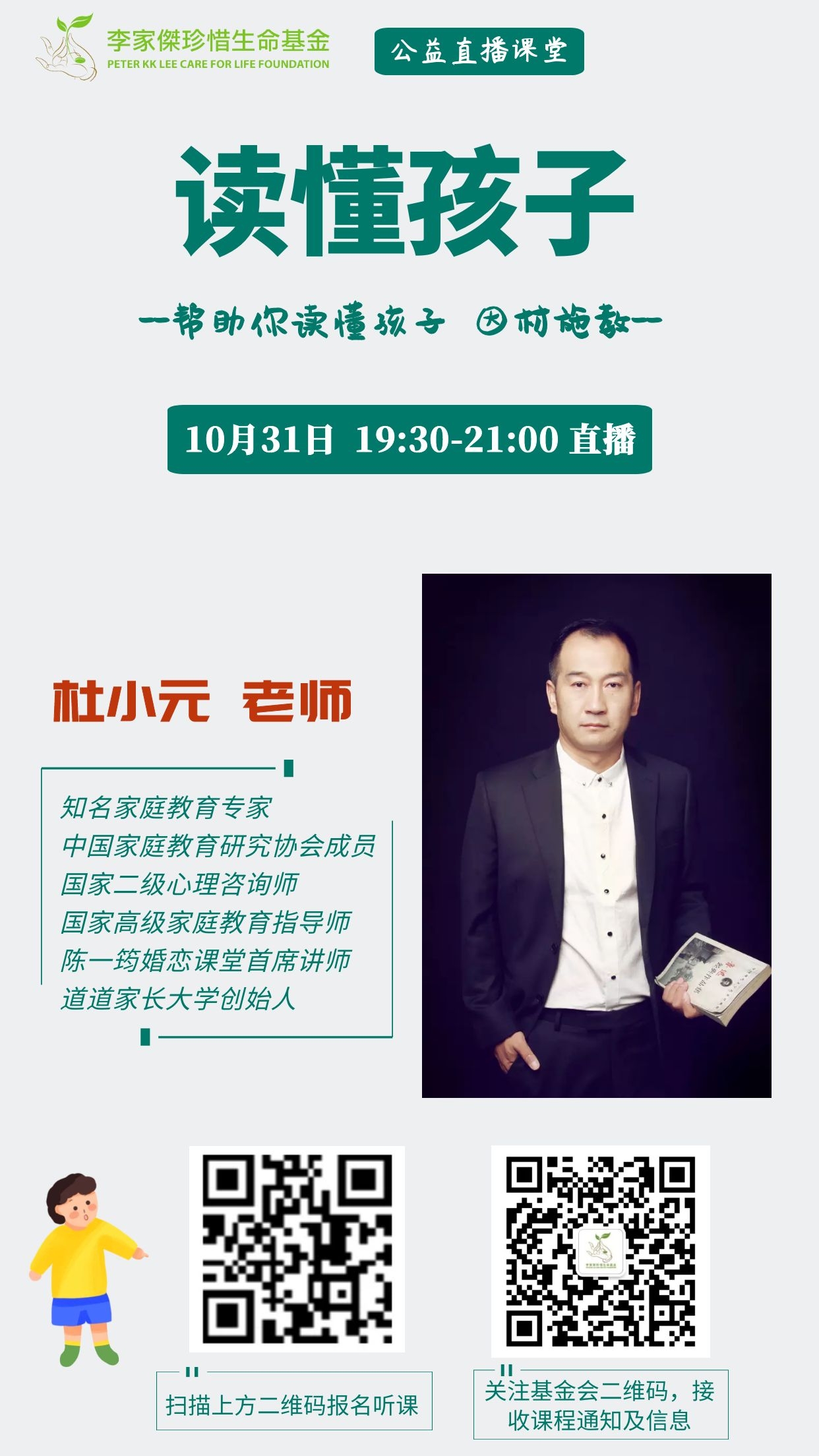 10月31日晚,邀请 杜小元老师,旨在帮助家长弄清楚自己孩子的先天学习风格,只有读懂孩子,因材施教,孩子才能高效学习。