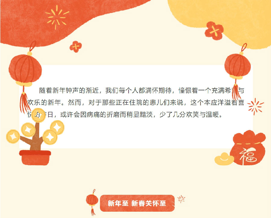 我们感谢所有一直以来,支持和帮助我们的朋友,同时也衷心呼吁更多的社会力量加入我们,一起为患儿们送上新年的祝福。愿我们的爱心汇聚成河,温暖每一个需要帮助的孩子。我们祈愿所有的孩子都能健康快乐,每个家庭都能团圆幸福。