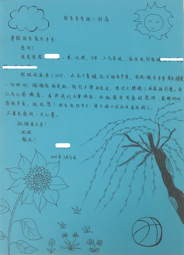 2019年8 月  在云南省阜外心血管病医院接受资助治疗并康复。今年再尚再次寄来了写给李先生的感谢信,洋溢着朴素的真情。