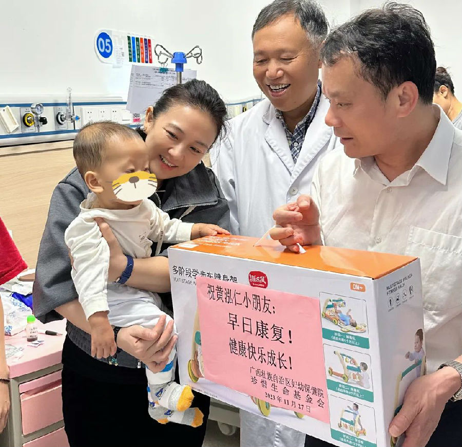 2023年11月27日,珍惜生命基金会总干事郭子源、副总干事陈文超等一行人,到广西壮族自治区妇幼保健院探望获得项目救助的先天性心脏病住院患儿,给孩子们送去医疗救助金及精美慰问品,并细心了解患儿病情,鼓励先心家庭顽强战胜病魔,早日康复。