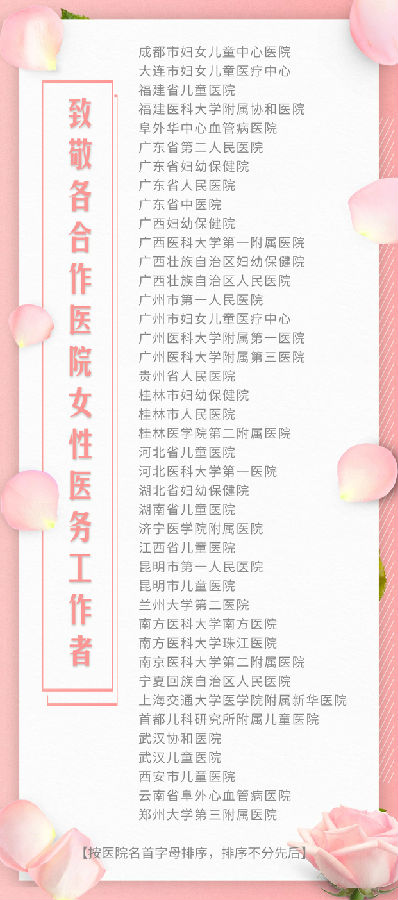 值此三八国际劳动妇女节之际,向全国40家定点合作医院的女性医务工作者们表达敬意,并送上节日的祝福。向公益项目各合作方、所有关心和支持基金会儿童医疗公益事业的各界女性爱心人士们,致以节日的问候。