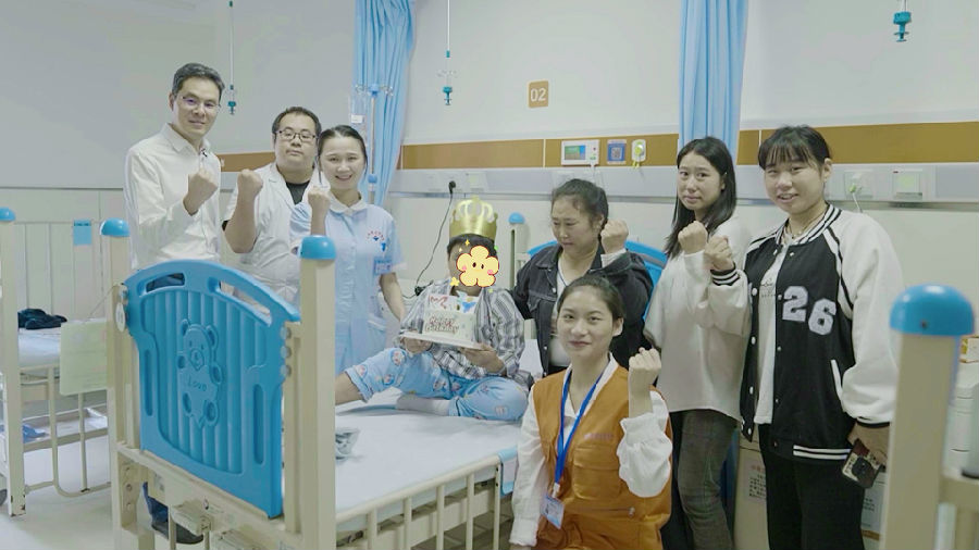 等待手术期间恰逢田田生日,社工部还特别准备了蛋糕,为他举行了一场简单而又特别的生日会。当孩子满心欢喜地切开蛋糕时,全家人的紧张焦虑情绪也得以得以缓解。