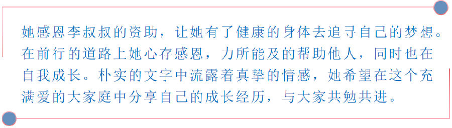 我很感谢李叔叔和基金会的全体工作人员,因为你们的帮助,让我有了健康的身体去追寻自己的梦想。我的愿望就是成为像李叔叔,像你们一样的人,用自己的能力去帮助更多人,用自己的专业知识减轻患者的痛苦。