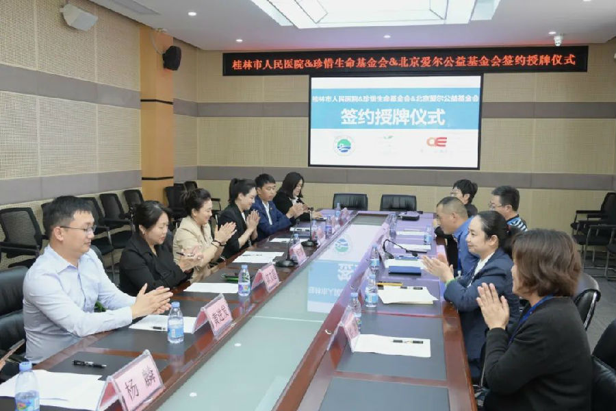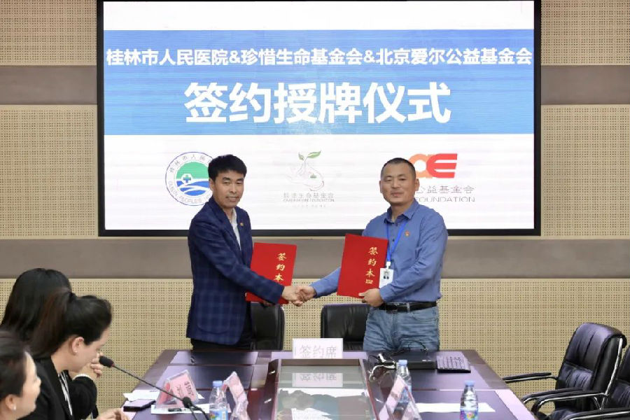 致辞结束后,北京爱尔公益基金会与桂林市人民医院双方代表进行了签约仪式,珍惜生命基金会郭子源总干事为桂林市人民医院进行了授牌。