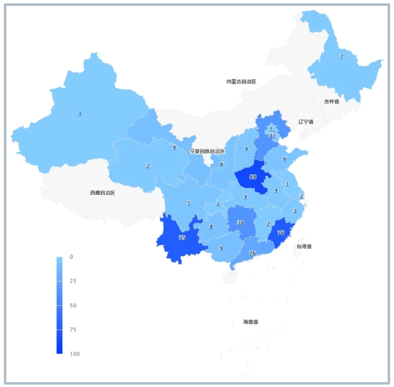 参与3月教育活动的家庭主要分布于河南、云南、福建、河北、湖南、广东等地,其他省份亦有分布。共分布24个省/区/市的260个县(区)